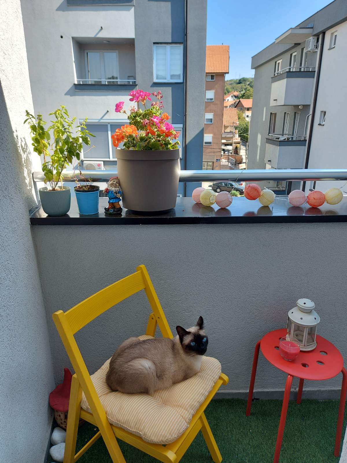 „Naša mala oaza mira usred grada. Svaki detalj na ovoj terasi biran je s ljubavlju – od pletenih stolica, viseće ljuljaške, do cveća koje nas svakodnevno obraduje bojama i mirisima. Ovde pijemo kafu, čitamo knjige i uživamo u trenucima tišine”, kaže vlasnica ove pažljivo i sa ukusom uređene terase.