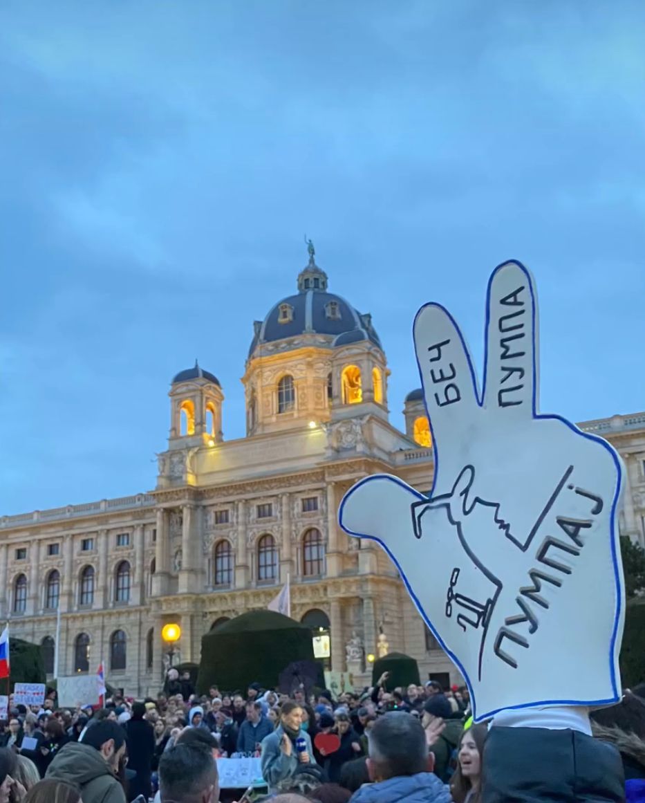 Na Trgu Marije Terezije okupilo se više hiljada ljudi, poreklom iz Srbije koji žive i rade u glavnom gradu u Beču. Oni su pozdravljali bicikliste, nosili transaprente i naravno pumpali uz sad već standardne pesme sa ovakvih skupova.