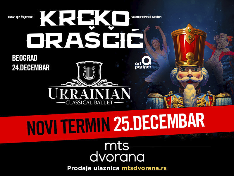 mts dvorana Dečanska 14, Beograd, SrbijaKrcko Oraščić, najomiljeniji božićni balet, koji iz godine u godinu tradicionalno oduševljava Beograđane, i ove godine biće održan u dva termina, 24. i 25. decembra u mts Dvorani u spektakularnoj izvedbi Ukrajinskog klasičnog baleta. Ljubitelji baleta će imati priliku da uživaju u čarobnom svetu Klare, djevojčice koja otkriva izvanredan dar ispod božićnog drvca - drvenu […]