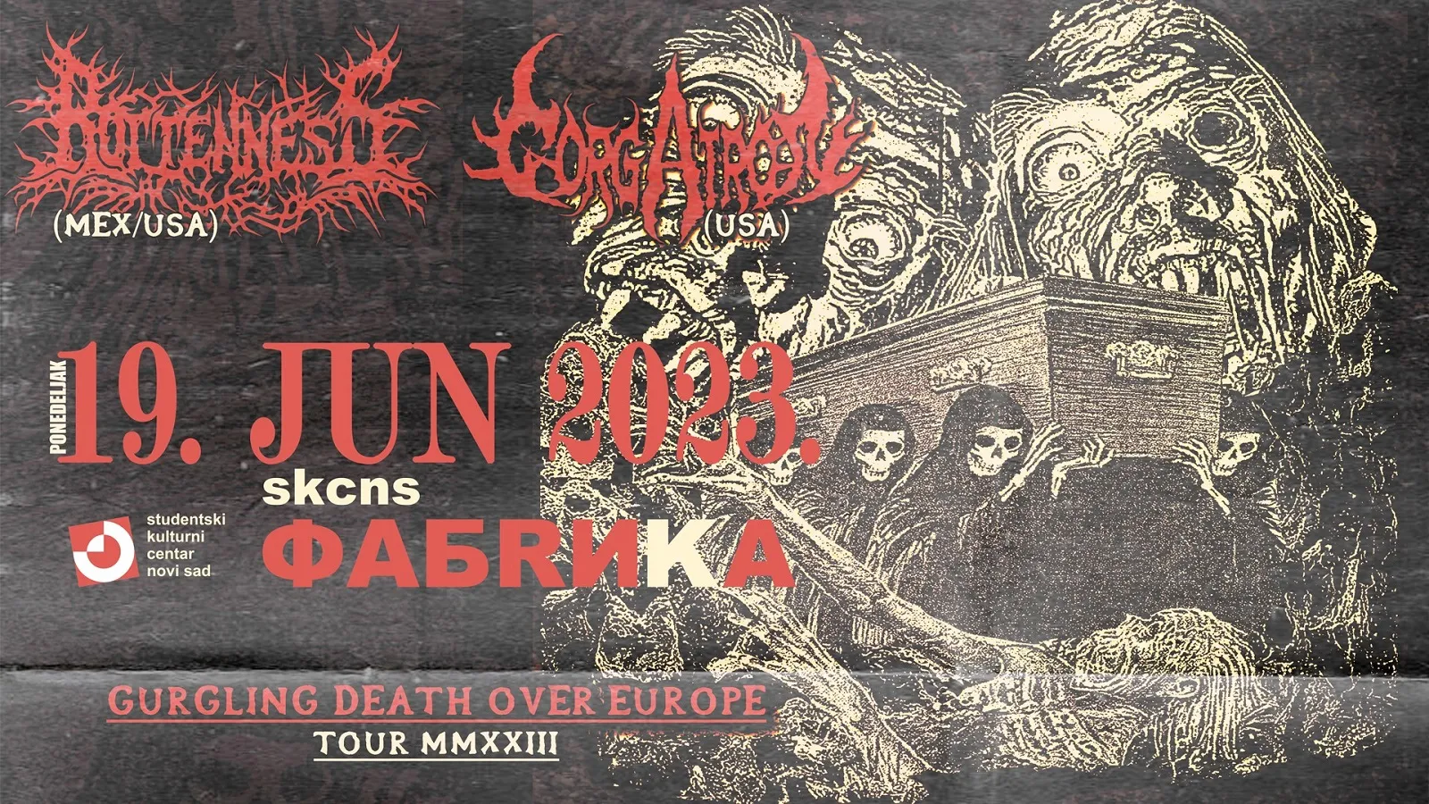Death metal bendovi Rottenness i Gorgatron, koji dolaze iz Meksika i Amerike, nastupiće 19. juna u SKCNS Fabrici. Ulaznice po ceni od 600 dinara moći će da se kupe na biletarnici Fabrike na dan koncerta. Koncert počinje u 21 čas, a biletarnica i vrata Fabrike otvaraju se u 20 časova. Rottenness je meksičko-američki brutal death […]